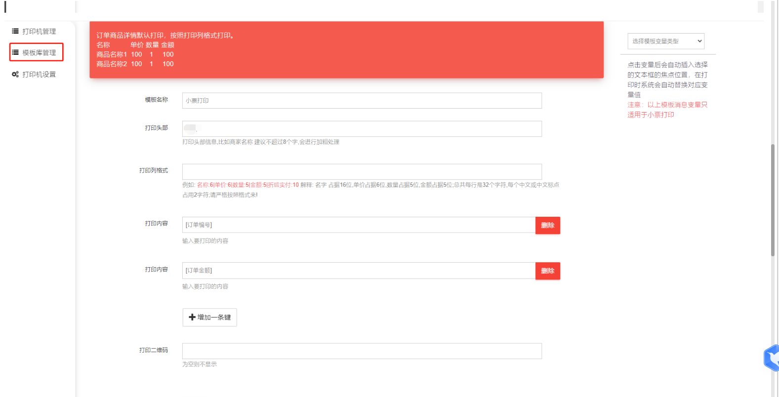 门店独立后台--pos打印机设置:这个是针对商米D2的,在打印机管理(旧)设置的模板后,在pos打印机设置才可以选择,商米D2下单可以根据这里的模板出小票