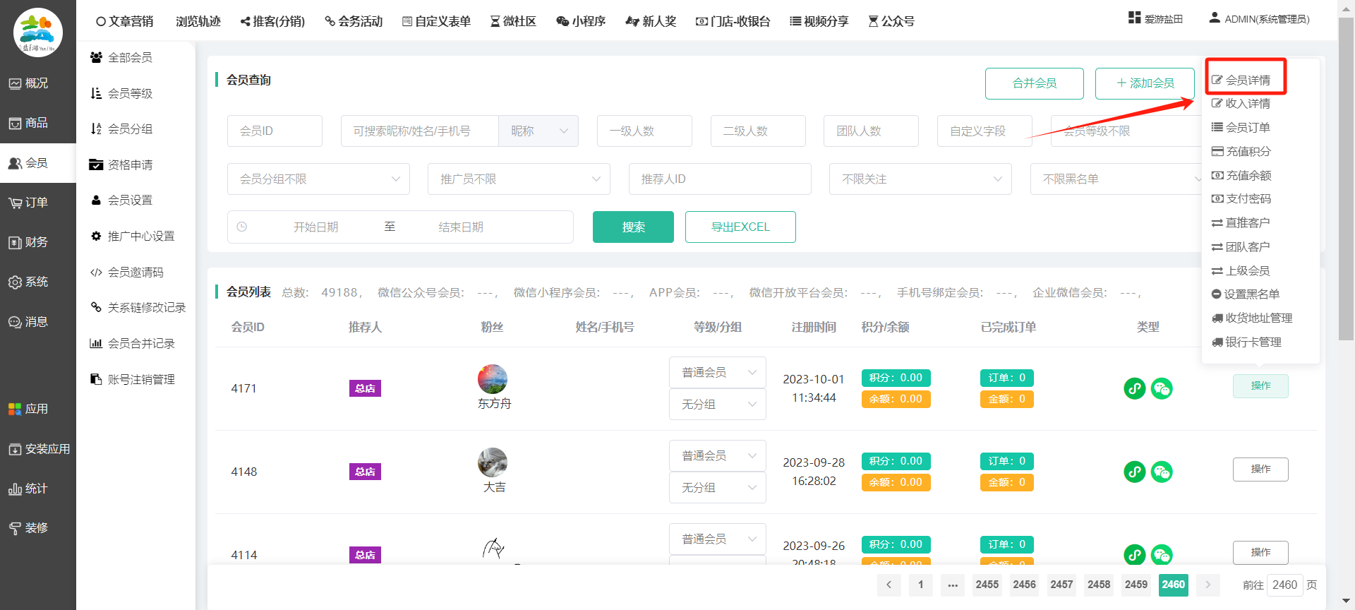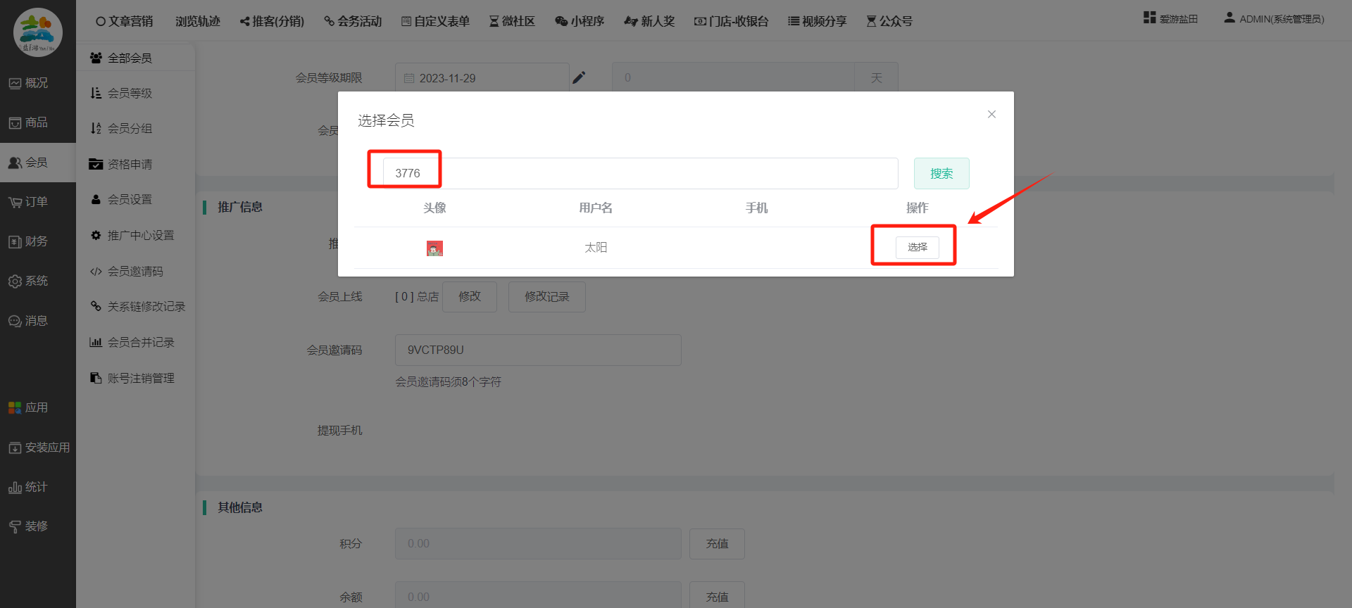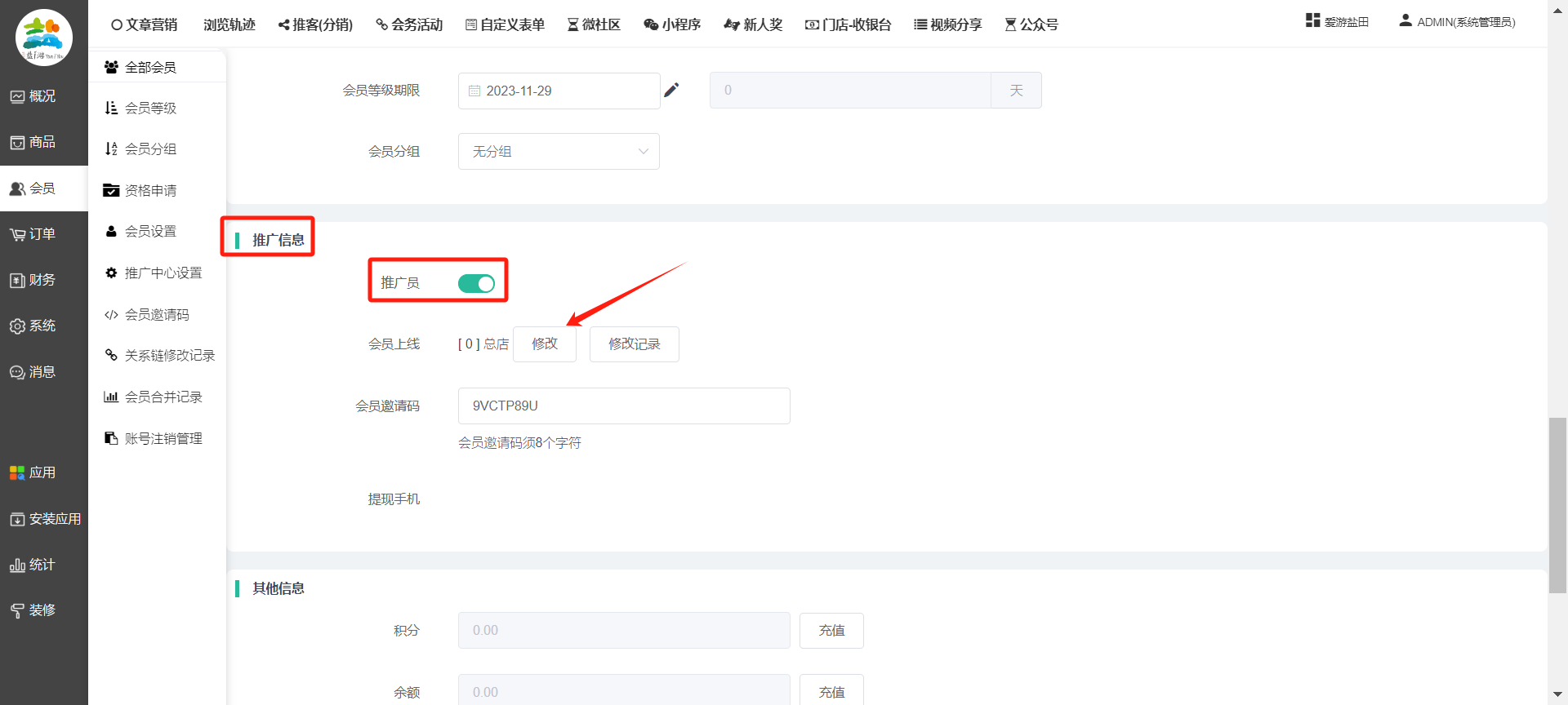 目录 搜索 展开 一、前期准备资料二、数字乡村码-上线操作指南1、服务号的申请流程及认证2、申请小程序流程3、开放平台绑定小程序和公众号三、数字乡村码-系统操作数字乡村码系统管理-概况数字乡村码-商品管理1、发布商品2、商品列表3、商品表单4、商品分类5、品牌管理6、配送模板7、评论管理8、优惠券管理9、商品标签10、退货地址设置11、满额优惠12、批量操作13、配送方式14、基础设置15、商品隐藏四、数字乡村码-会员管理1、全部会员2、会员等级3、会员分组4、资格申请5、会员设置6、推广中心设置7、会员邀请码8、会员关系链修改关系链修改记录9、会员合并记录10、账号注销管理11、会员设置中心五、数字乡村码-订单管理1、订单管理列表2、订单处理流程3、订单状态4、订单修改价格5、订单退款退货6、多包裹发货7、批量发货订单操作步骤8、催发货订单9、物流查询六、数字乡村码-财务管理1、余额设置2、会员余额3、充值记录4、转让记录5、余额明细6、收入明细7、提现设置8、提现统计9、积分管理10、转账审核11、收益广告12、批量充值七、数字乡村码-系统管理1、商城入口2、商城设置①、商城设置②、订单设置③、物流查询④、短信⑤、联系方式⑥、分类⑦、优惠券⑧、分享⑨、幻灯片⑩、广告位⑫、地图设置3、交易设置4、微信模板消息自定义消息模板(新版)自定义消息模板(旧版)小程序消息模板公众号模板消息变更公告5、语言设置6、权限管理7、多媒体管理八、数字乡村码-消息管理九、数字乡村码-应用管理十、数字乡村码系统-数据统计十一、数字乡村码-页面装修DIY1、模板管理2、店铺页面3、顶部导航4、底部导航5、DIY模板市场6、首屏广告7、基础设置8、装修DIY尺寸建议十二、供应商功能插件操作指南1、供应商2、门店-收银台门店申请和使用步骤门店管理①、门店-收银台 营销设置②、门店-收银台 分润设置门店分类门店申请门店审核门店商品门店商品订单收银台订单数据统计核销员基础设置默认设置门店装修3、微社区4、会务活动十三、营销插件操作指南活动报名提货卡新人奖微店问卷调查积分视频分享1、视频分享基础设置2、视频分享发现管理3、视频分享分类管理4、视频分享评论管理5、视频分享分红记录6、视频分享短视频中心每日红包幸运大抽奖签到优惠券二维码任务奖励优惠劵文章音频文章付费文章限时购新海报拓客卡操作流程积分活动素材中心视频红包十四、入驻门店应用类1、门店预约2、附近商品3、门店定位设置4、门店控制5、门店满额包邮6、门店满额减7、导入商品8、门店搜索9、门店股东10、核销券11、多门店核销1、商城后台设置2、前端功能演示十五、常见问题1、后台登录密码修改流程2、会员-余额,积分,后台如何进行充值与扣除3、如何修改上下级关系4、一种万能的获取商城小程序路径的方法 暂无相关搜索结果! 阅读次数:1638 本文档使用 模王系统 发布 8、会员关系链修改 8、会员关系链修改一.如何修改上下级关系?1.会员-全部会员-可以通过搜索用户的独立ID,或者用户微信昵称,找到此会员,然后点击右边的(操作)2.再点击会员详情。3.滑到下面,有个推广信息-会员上线,点击修改4.输入上级的ID号,点击搜索,出来此上级会员后点击选择。5.滑到最下面,一定要点击提交按钮。文档更新时间: 2023-11-30 14:56 作者:链上旅行
