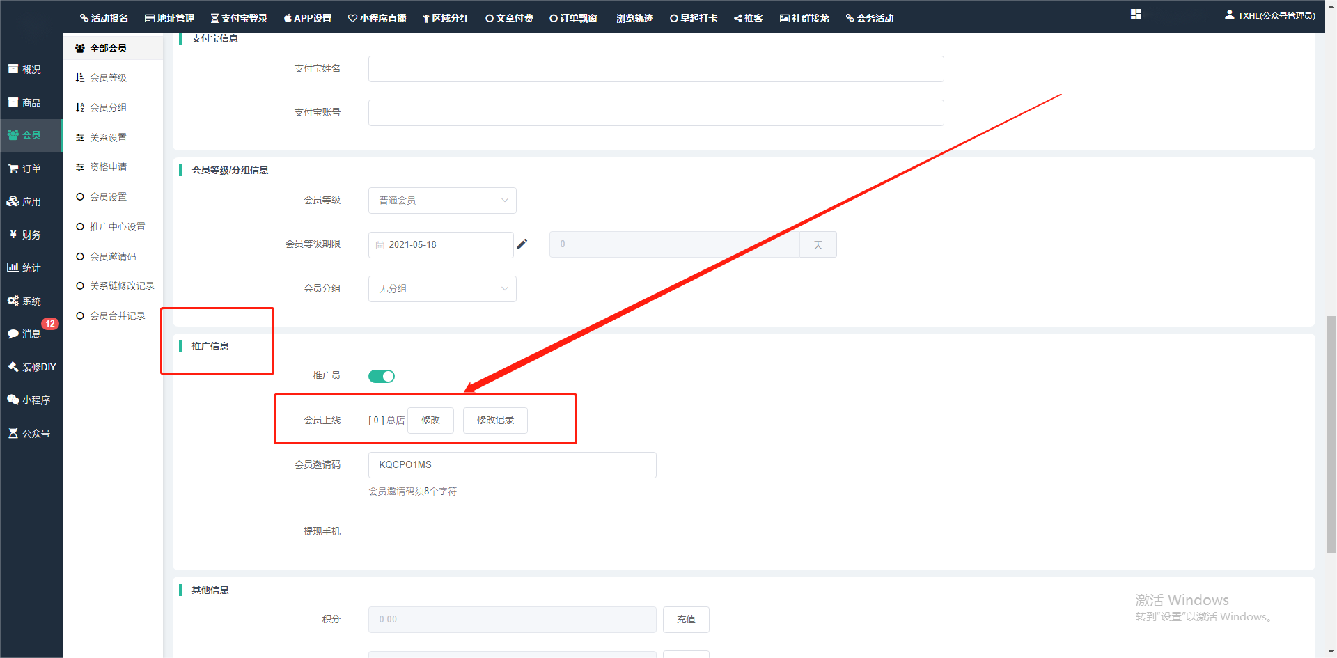 目录 搜索 展开 一、前期准备资料二、数字乡村码-上线操作指南1、服务号的申请流程及认证2、申请小程序流程3、开放平台绑定小程序和公众号三、数字乡村码-系统操作数字乡村码系统管理-概况数字乡村码-商品管理1、发布商品2、商品列表3、商品表单4、商品分类5、品牌管理6、配送模板7、评论管理8、优惠券管理9、商品标签10、退货地址设置11、满额优惠12、批量操作13、配送方式14、基础设置15、商品隐藏四、数字乡村码-会员管理1、全部会员2、会员等级3、会员分组4、资格申请5、会员设置6、推广中心设置7、会员邀请码8、会员关系链修改关系链修改记录9、会员合并记录10、账号注销管理11、会员设置中心五、数字乡村码-订单管理1、订单管理列表2、订单处理流程3、订单状态4、订单修改价格5、订单退款退货6、多包裹发货7、批量发货订单操作步骤8、催发货订单9、物流查询六、数字乡村码-财务管理1、余额设置2、会员余额3、充值记录4、转让记录5、余额明细6、收入明细7、提现设置8、提现统计9、积分管理10、转账审核11、收益广告12、批量充值七、数字乡村码-系统管理1、商城入口2、商城设置①、商城设置②、订单设置③、物流查询④、短信⑤、联系方式⑥、分类⑦、优惠券⑧、分享⑨、幻灯片⑩、广告位⑫、地图设置3、交易设置4、微信模板消息自定义消息模板(新版)自定义消息模板(旧版)小程序消息模板公众号模板消息变更公告5、语言设置6、权限管理7、多媒体管理八、数字乡村码-消息管理九、数字乡村码-应用管理十、数字乡村码系统-数据统计十一、数字乡村码-页面装修DIY1、模板管理2、店铺页面3、顶部导航4、底部导航5、DIY模板市场6、首屏广告7、基础设置8、装修DIY尺寸建议十二、供应商功能插件操作指南1、供应商2、门店-收银台门店申请和使用步骤门店管理①、门店-收银台 营销设置②、门店-收银台 分润设置门店分类门店申请门店审核门店商品门店商品订单收银台订单数据统计核销员基础设置默认设置门店装修3、微社区4、会务活动十三、营销插件操作指南活动报名提货卡新人奖微店问卷调查积分视频分享1、视频分享基础设置2、视频分享发现管理3、视频分享分类管理4、视频分享评论管理5、视频分享分红记录6、视频分享短视频中心每日红包幸运大抽奖签到优惠券二维码任务奖励优惠劵文章音频文章付费文章限时购新海报拓客卡操作流程积分活动素材中心视频红包十四、入驻门店应用类1、门店预约2、附近商品3、门店定位设置4、门店控制5、门店满额包邮6、门店满额减7、导入商品8、门店搜索9、门店股东10、核销券11、多门店核销1、商城后台设置2、前端功能演示十五、常见问题1、后台登录密码修改流程2、会员-余额,积分,后台如何进行充值与扣除3、如何修改上下级关系4、一种万能的获取商城小程序路径的方法 暂无相关搜索结果! 阅读次数:1525 本文档使用 模王系统 发布 3、如何修改上下级关系 如何修改上下级关系一.如何修改上下级关系?1.会员-全部会员-可以通过搜索用户的独立ID,或者用户微信昵称,找到此会员,然后点击右边的(操作)2.再点击会员详情。3.滑到下面,有个推广信息-会员上线,点击修改4.输入上级的ID号,点击搜索,出来此上级会员后点击选择。5.滑到最下面,一定要点击提交按钮。文档更新时间: 2024-01-05 14:50 作者:链上旅行