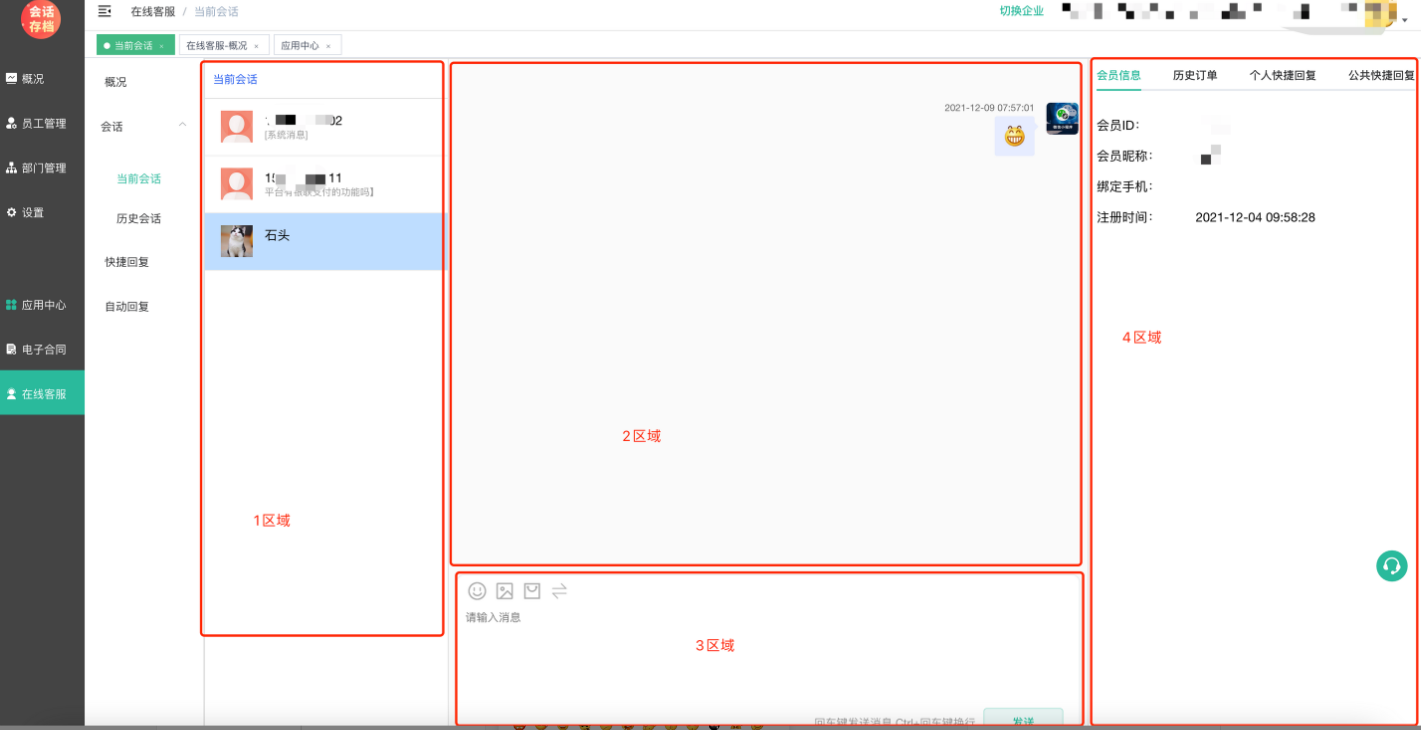 2区域:会话内容,显示客服和会员之间聊天的内容,类似QQ\微信等聊天界面;